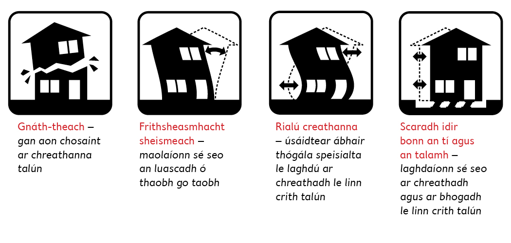 I mbailte agus i gcathracha sna ceantair seo, bíonn rialacha tógála ann a chinntíonn go mbíonn gach teach nó foirgneamh úr a thógtar deartha go speisialta, le go seasfaidh siad níos fearr i gcoinne na gcreathanna talún. Baintear úsáid as ábhair thógála éadroma solúbtha, le nach mbeidh an oiread céanna gortuithe nó básanna ann má thiteann tithe agus foirgnimh ar dhaoine le linn creathanna talún.