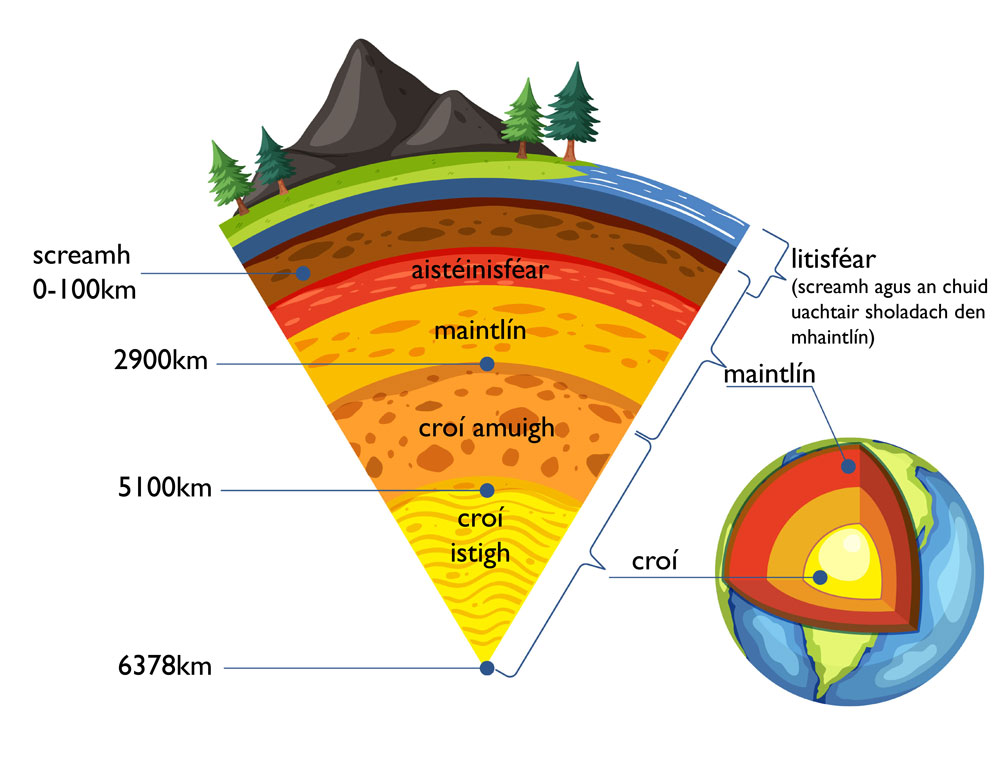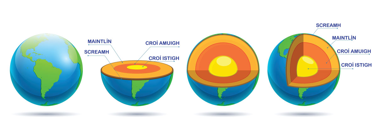 Tugaimid ‘screamh’ an Domhain ar an chlúdach charraigeach atá ar dhromchla an phláinéid s’againn, agus ní píosa mór soladach amháin atá ann.