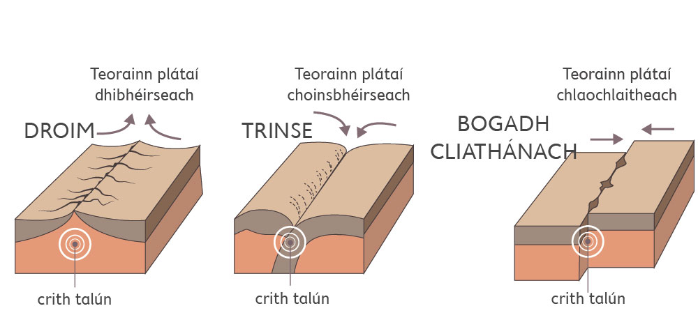 An méid a tharlaíonn don talamh ag na teorainneacha plátaí difriúla